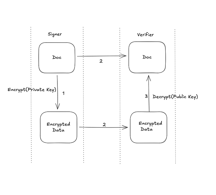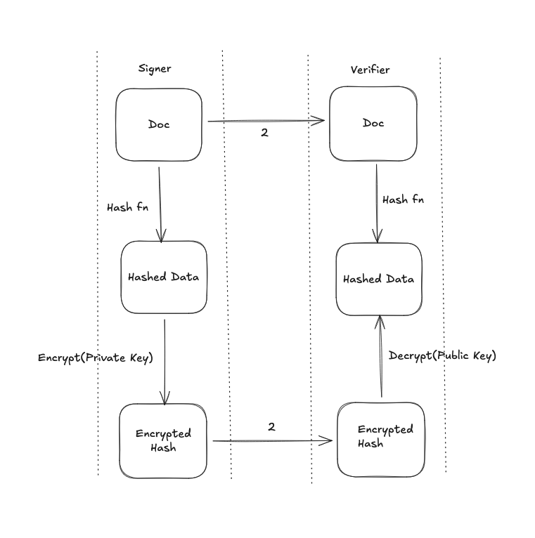 The problem with the above approach is that asymmetric encryption for big docs is a bit expensive. In practice, we hash the doc and then encrypt the hashed doc with our private key. The result is a “digital signature”. We send the digital signature, hashing algorithm used and the doc to the other party. The other party hashes the doc with same hashing function, decrypts the signature using public key and then compares both object. If it’s same, it proves the doc was sent by you.