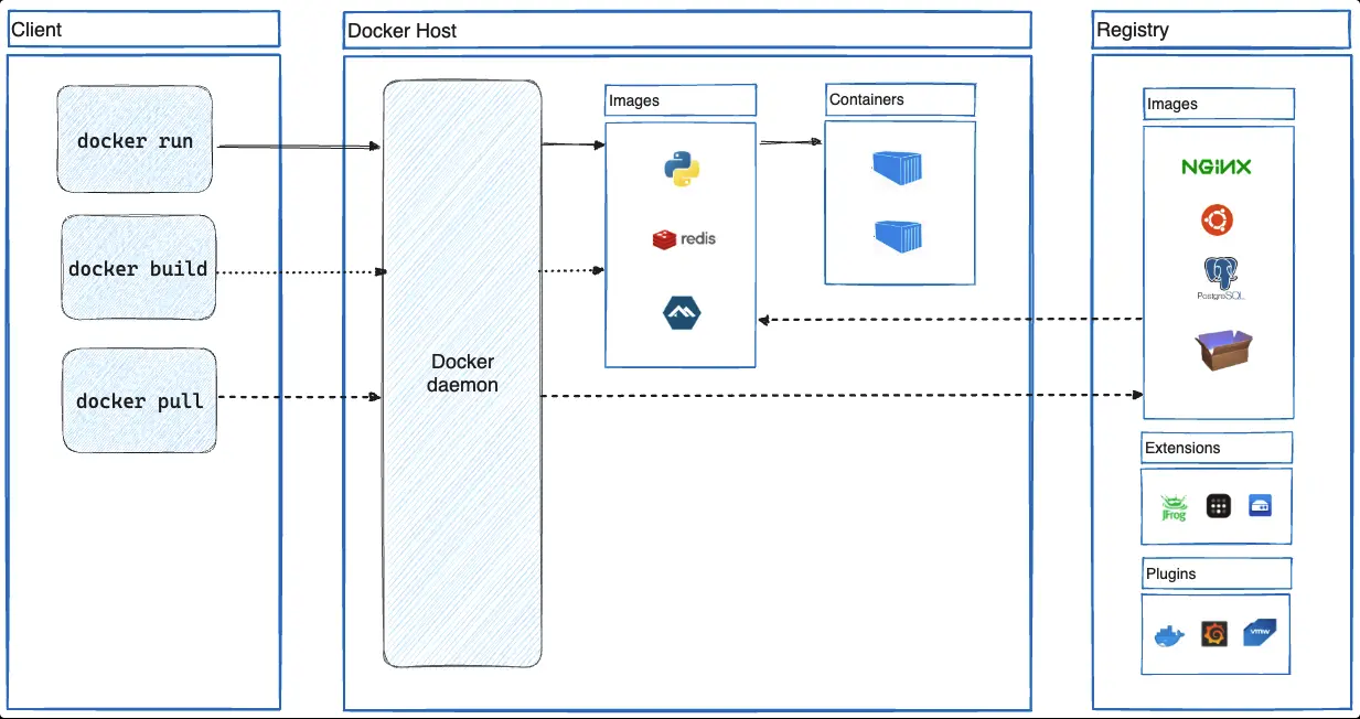 -> Docker uses a client–server architecture. The Docker Client (CLI) sends commands like build and run to the Docker Daemon. The Docker Daemon builds images, runs containers, and manages networks & volumes. Docker Images are read-only templates used to create containers. Containers are lightweight, isolated runtime instances sharing the host OS kernel.